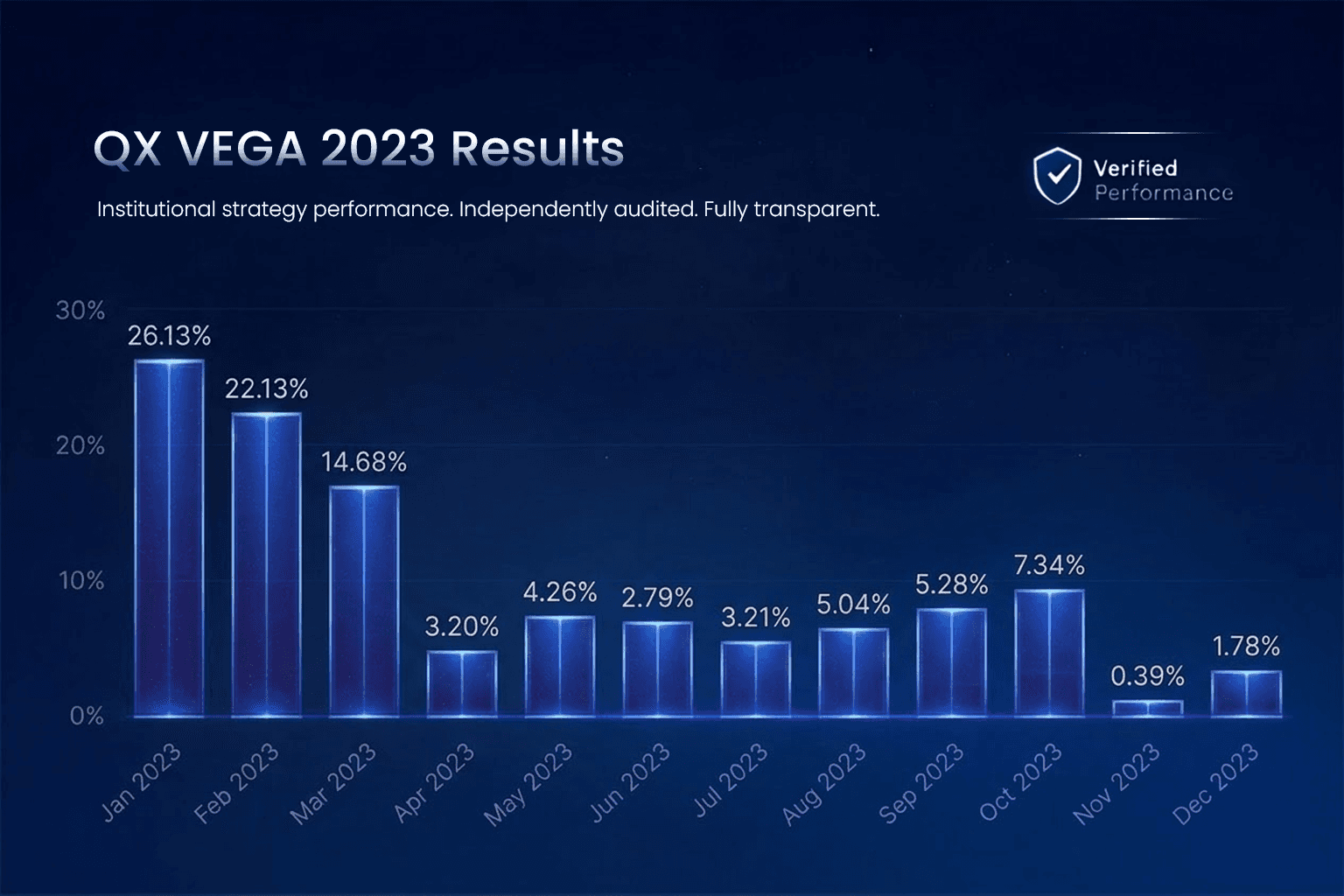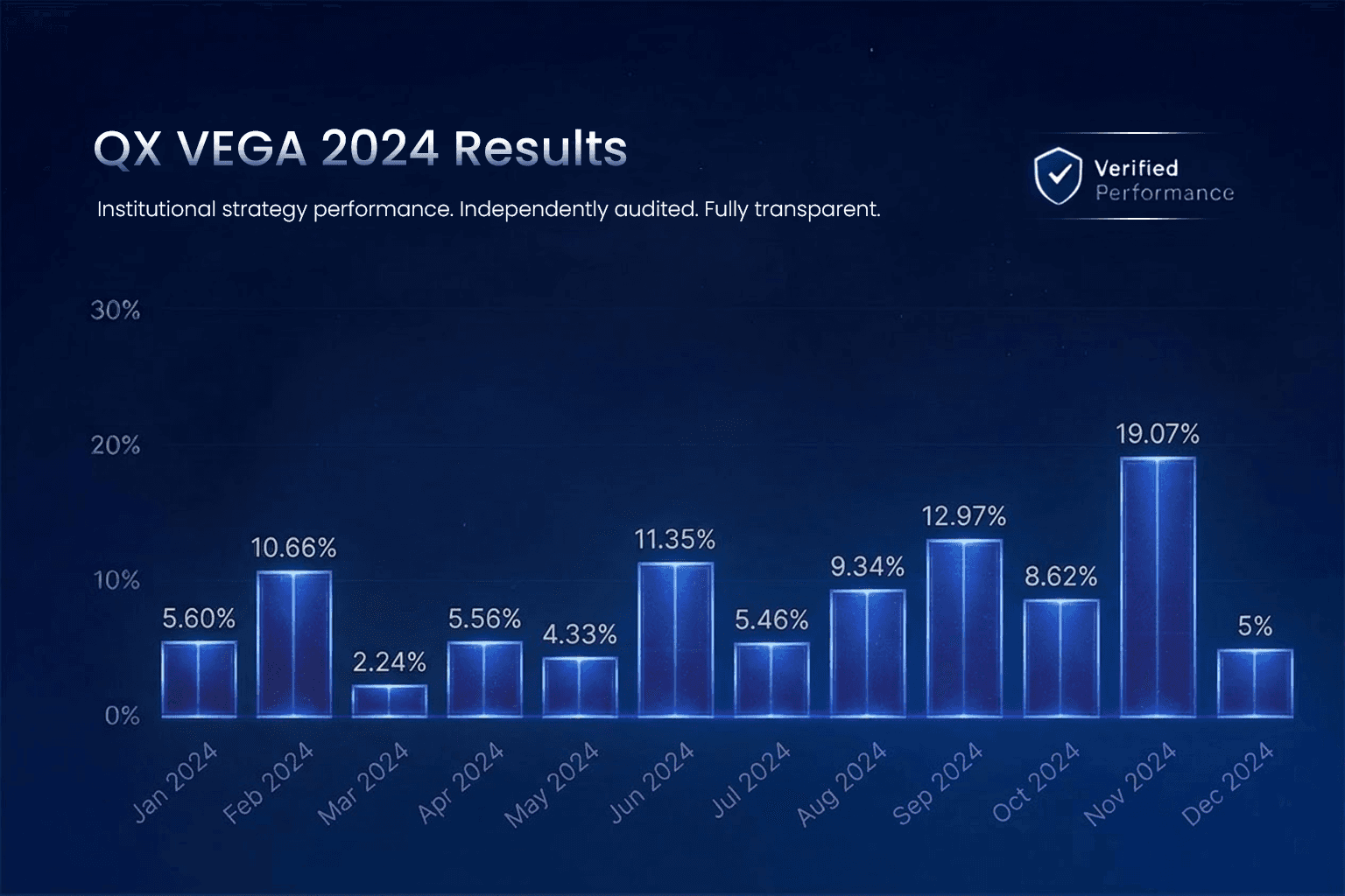 QuantX works exclusively with institutional asset managers with proven track records managing institutional and high-net-worth portfolios. Additionally, all results are independently audited by third parties such as Alpha Verification and Myfxbook, ensuring maximum transparency and reliability.